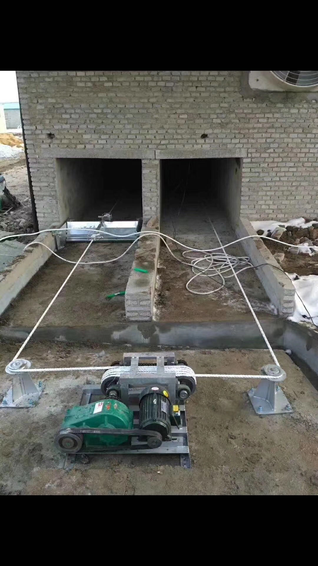 刮粪机安装,地沟地沟设计一般建议设计成一边深一边浅,深的那边应是出粪和固定主机的地方,深的那头一般设计成30-35厘米,浅的那头一般设计成16-18厘米即可,这样便于清舍时候拿水往一头流,另外便于主机隐藏于地下。主机主机安装应挖成1米见方,深70厘米的坑,然后使混凝土浇注,浇注完上平面应比地沟底面低12-13厘米,打上预埋铁,便于安装主机,拿电焊点上几点即可.或使用大号膨胀螺丝也可。转角轮安装转角轮千万要注意,参考安装图,绳子绕的轮槽边是中心,不是转向轮的轴是中心,如果中心找错了,刮粪时粪板将跑偏不稳定。中心找好后用混凝土浇注,浇注至转向轮轴露出来4厘米即可。转向轮高度,从沟底往上量20厘米水泥墩60*60绕绳绕绳的时候,应先把绳子一头在主机两个绕绳轮绕满,然后再把转向轮绕上。在一个刮粪板上扣死即可。紧绳紧绳应该有2个人,1个人把着开关,另1个人把绳子从刮粪板架子上绕过去,然后把绳子头固定的转向轮的轴上,然后一个人拉绳子,一个人开开关,主机把绳子拉紧即可。